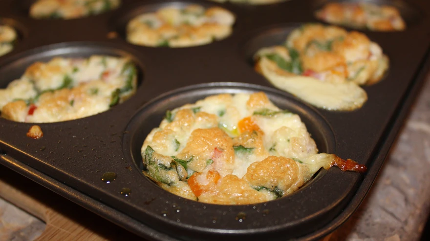 Vooderda muffinvormis kuus pesa pabervormiga ja löö iga vormi sisse üks muna. Tõsta igale munale peale teelusikatäis hakitud sibulat, tomatit, suvikõrvitsat. Maitsesta soola ja pipraga. Tõsta peale riivjuustu ja näputäis Vahemere ürti.