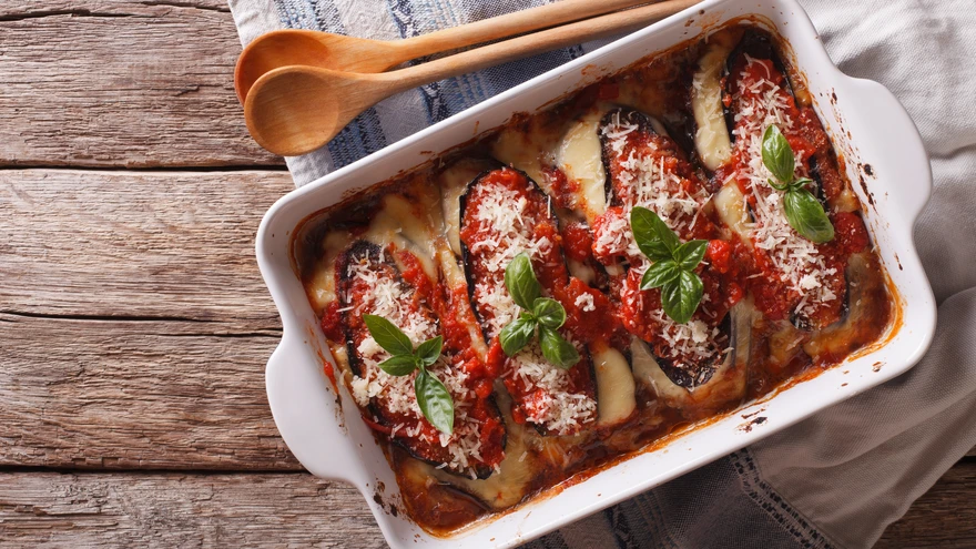 Määri ahjuvorm õliga. Peida põhi tomati-läätsekastmega. Lao peale kiht baklažaaniviile. Viiluta mozzarellapallid ja lisa üks neist vormi. Raputa peale riivitud mozzarella`t ja basiilikut. Pane järjest nii mitu kihti baklažaaniviile ja kastet, kuni kõik on ära kasutatud. Pealmiseks kihiks jääb riivitud mozzarella.