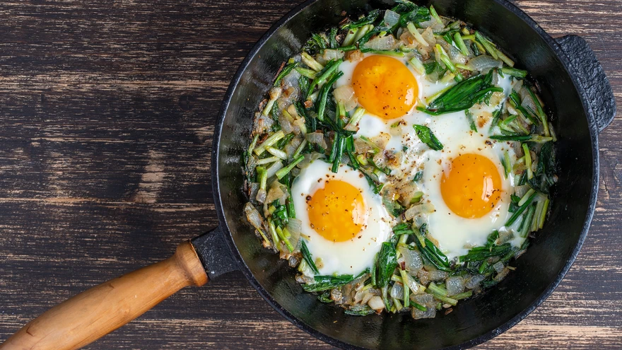 Haki roheline ja kuumuta kergel pannil õlis või võis. Löö peale munad, kata kaanega ja kuumuta pisut.