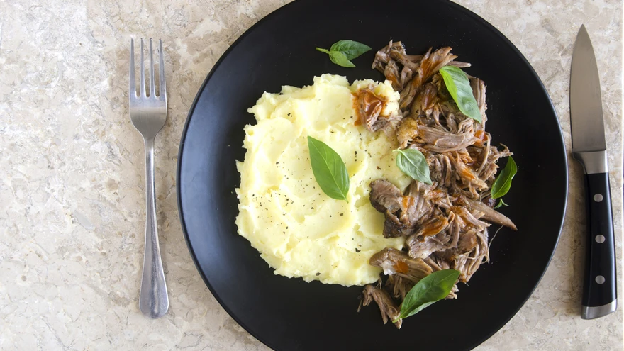 Tõsta liha potist välja, jäta küpsetusleem potti. Liha võib kahvliga laiali tõmmata, sest see on nii pehme, et sulab suus.