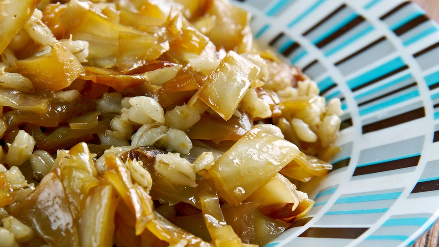 Lisa tatar ja umbes 2 dl vett, sool ja pipar ning hauta madalal kuumusel. Kui toit jääb liiga kuivaks ja kipub pähja kinni jääma, lisa veel vett. Hauta, kuni kapsas ja tatar on pehmed.