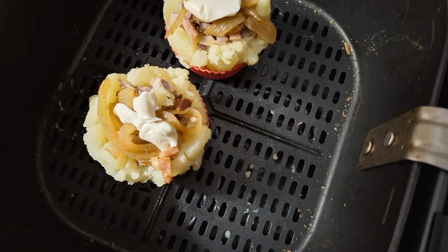 Keeda kartulid pehmeks. Pane soojad keedetud kartulid muffinivormidesse ja vajuta klaasipõhjaga kartulitesse lohud. Kui kartul mureneb, siis vormi kätega parajad kartulikausikesed. Täida lohud hakklihaseguga, pane peale teelusikatäis toorjuustu ja kata riivjuustuga.