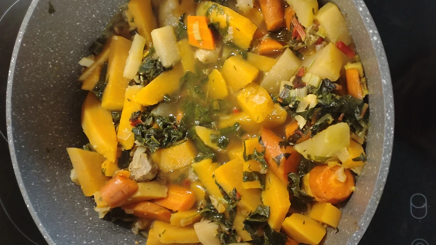 Hauta madalal kuumusel kuni köögiviljad ja lihatükid on pehmed. Haki lehtkapsas või -peet ja lisa potti. Lisa vajadusel maitseaineid.