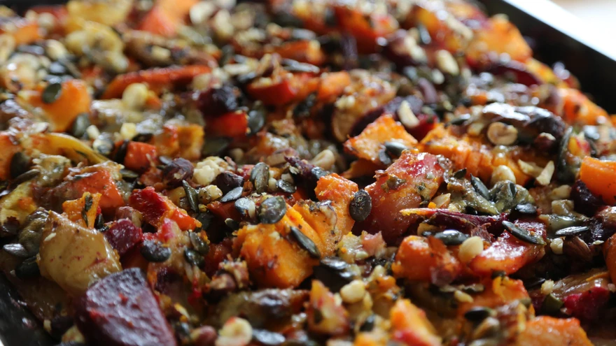 Tükelda köögiviljad. Kartulid võivad olla suuremad tükid, porgandid väiksemad nin kaalikad ja peedid kõige väiksemad. Pane köögiviljad küpsetuspaberiga kaetud ahjuplaadile ja nirista peale õli, puista seemneid, soola ja pipart. Sega, et kõik tükid oleksid õliga kaetud. Kuna peet värvib teised köögiviljad punaseks, siis võib teha ka kõigist köögiviljadest eraldi ribad.