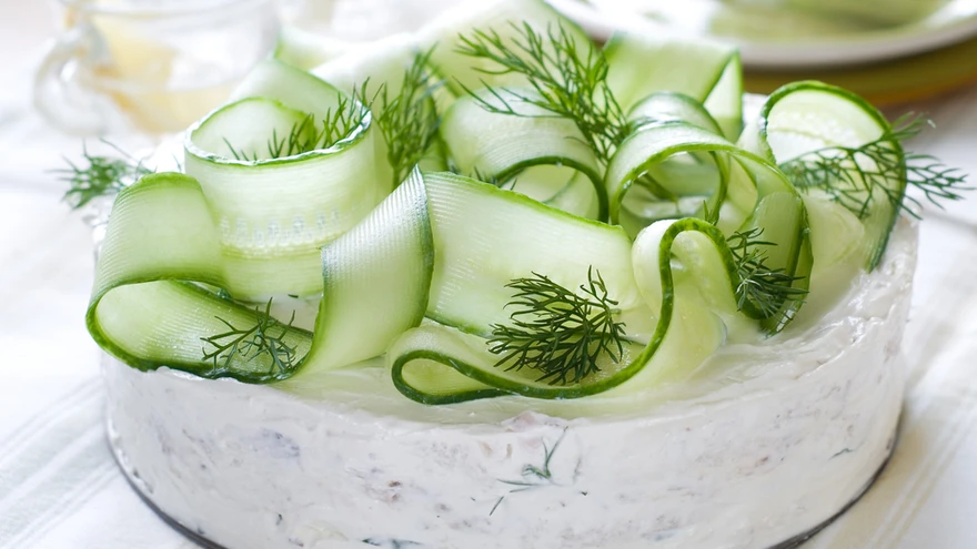 Tõsta tahke pirukas kile abil vormist välja ja pane serveerimisalusele. Raputa peale idusid, võrseid ja kaunista kurgilaastudega.