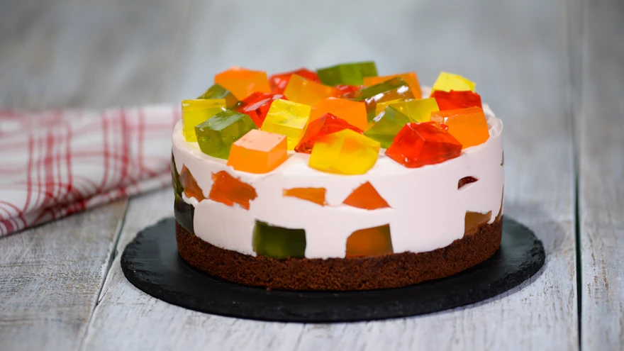 Lõika tarretunud mahl kuubikuteks ja sega osa kuubikuid jogurti hulka. Kalla jogurt toidukilega vooderdatud koogivormi ja pane külmkappi tarduma. Kaunista ülejäänud mahlakuubikutega.
