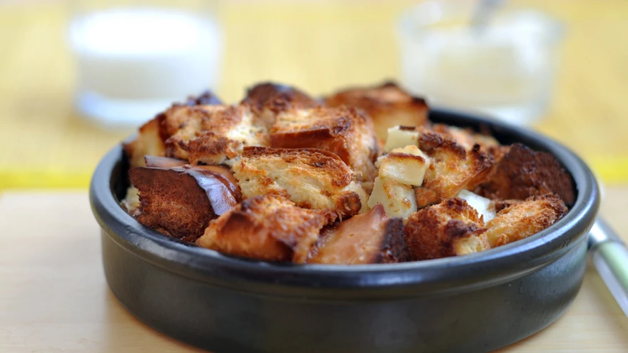 Määri ahjuvorm võiga ja aseta pool leivakuubikutest vormi põhja, nende peale õuna ja apelsintükid ja kiht kohupiimapastat, kõige peale ülejäänud leivakuubikud.