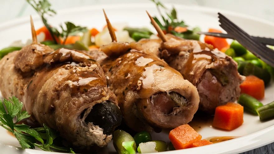 Määri lihalõikudele sinepit, maitsesta soola ja pipraga, kata peekoniga ja pane iga lõigu keskele porgandiriba, sellerivars ja pool hakitud petersellist. Keera rulli ja kinnita tikuga.