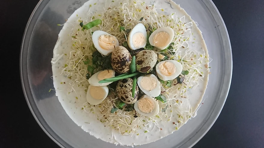 Pane toorjuust, hapukoor ja mädarõigas köögikombaini ja töötle kreemiks. Seda võib teha ka kausis puulusikaga, kuid siis läheb rohkem aega. Eemalda koogivormilt serv ja toidukile ning määri toorjuustukreem spaatliga tordile. Kaunista roheliste idude, võrsete ja vutimundega.