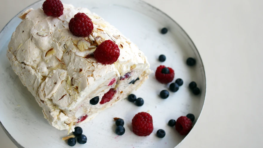 Vahusta koor suhkruga, sega hulka jogurt ja maitsesta sidrunimahlaga. Määri vaht jahtunud beseepõhjale. Raputa peale värsked marjad. Keera beseepõhi pikemast servast rulli, kasutades küpsetuspaberi abi.