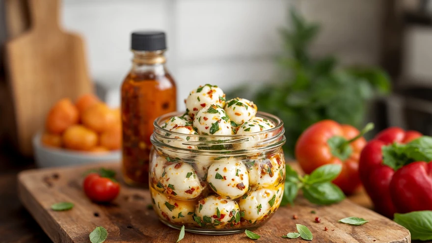 Sega klaaspurgis õli, sidrunimahl ja riivitud koor, küüslauk, pune ja sool. Lisa mozzarella. Lase vähemalt paar tundi külmkapis marineerida.