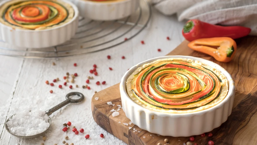 3. Küpseta pirukapõhja 200-kraadises ahjus 8-10 minutit. Määri hapukooresegu põhjale. Keera porgandi ja suvikõrvitsaribad pirukapõhjale. Ribadest võib teha ka väikesed värvilised rullid ja täita nendega põhi. Pintselda õliga ja küpseta 200-kraadises ahjus 30 minutit, kuni porgandi ja suvikõrvitsaroosid on küpsed.