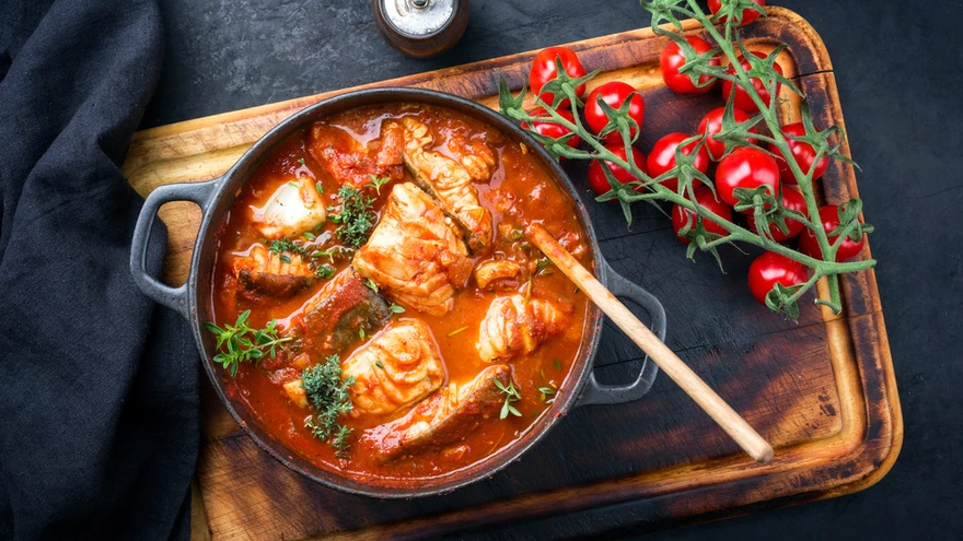 Koori ja haki sibulad ja küüslauguküüned. Koori ja tükelda kartulid. Lõika kalafileed ja paprika üsna suurteks tükkideks. Kuumuta hakitud sibulat ja küüslauku poti põhjas õlis, kuni sibul on pehme. Lisa kartul, paprika, loorberilehed, pool hakitud petersellist, tükeldatud tomat, pipraterad, tomatipasta. Vala peale valge vein ja maitsesta soolaga. Lisa vajadusel natuke vett, et kõik oleks kaetud. Kuumuta ja hauta vaiksel tulel umbes 10 minutit. Pane peale kalatükid ja hauta veel 10-15 minutit, kuni kalad on küpsed. Lase viis minutit maitsetel tõmmata, puista peale hakitud peterselli ja tõsta sügavatesse taldrikutesse koos rohke kalapuljongiga.