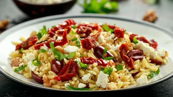 Sega pisut jahtunud baklažaanitükid, paprika, sibulaviilud, rosinad ja sidrunimahl keedetud pastaga. Tõsta peale kirsstomatid.