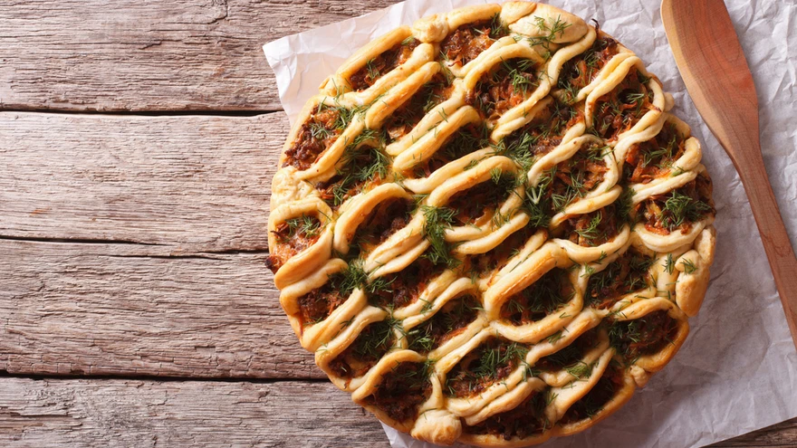 Jaga tainas suuremaks ja väiksemaks pooleks ja rulli õhukeseks. Kata võiga määritud ümmarguse vormi põhi tainaga ja lõika servast ülejääv osa ära. Vajuta jahtunud kapsasegu vormi.