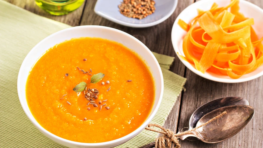 Püreesta saumikseriga ühtlaseks. Püreesta saumikseriga mandariinid. Lisa supile kookoskoor või kohvikoor, purustatud mandariinid ja kuumuta keemiseni ja maitsesta natukese soolaga.