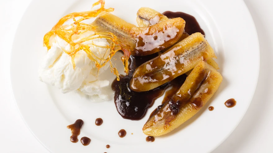 Jaga banaanid taldrikutele, nõruta peale pannil olev leem ja tõsta peale šokolaad. Serveeri koos jäätisepalliga.