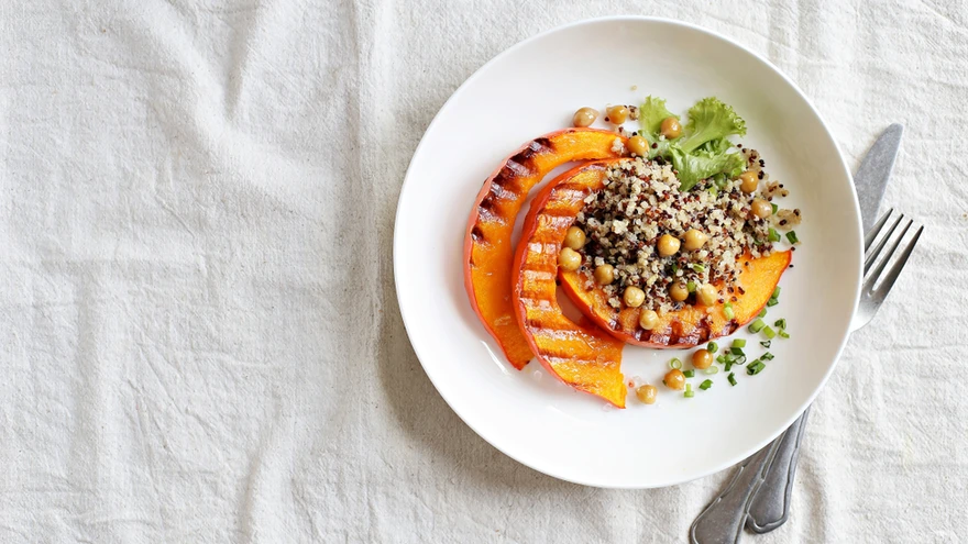 Pane taldrikule salatilehti aseta peale kõrvitsalõigud, lisa kuhjake kinoad ja kikerherneid.