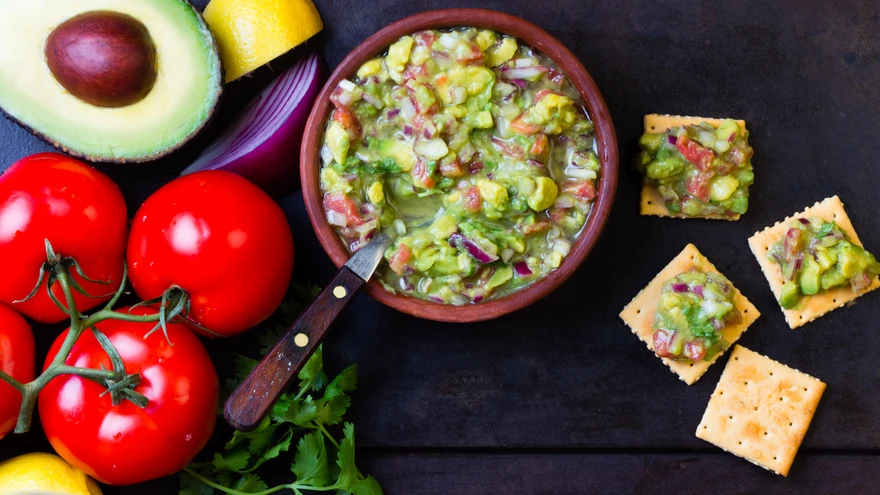 Lõika tomatid sektoriteks, eemalda seemned ja haki peeneks. Poolita avokaadod, eemalda seemned ja tükelda viljaliha. Haki sibulad ja ürdid.