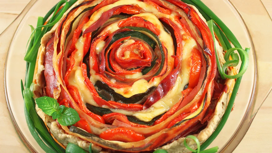 Määri pirukapõhjale toorjuustu. Lao kihiti ringiratast suvikõrvitsa-, tomati- ja juustuviile. Vahele võib puistata meelepärast ürti. Tilguta peale pisut õli.