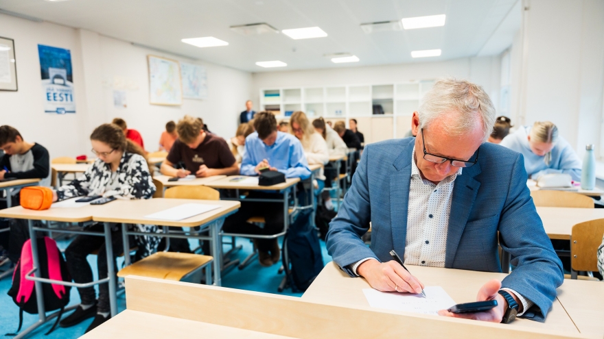 TalTechi rektor Tiit Land lahendas e-rehkendust Pärnu Koidula Gümnaasiumi noortega, selle kooli vilistlaste osakaal tehnikaülikooli sisseastujate seas on aastaid kõrgeim. | Henri-Kristian Kirsip