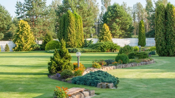 Ei võililli, ei orasheina, vaid hoopis õitevahus istutusalad okaspuude kõrval ja nende vahel voogav ühtlane sametine muruvaip. Silma ei jää midagi, mis häiriks ja harmooniat rikuks....