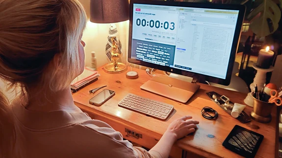 Liplap oma igapäevases töökeskkonnas, esiplaanil prototüüp põrandavalgustist.